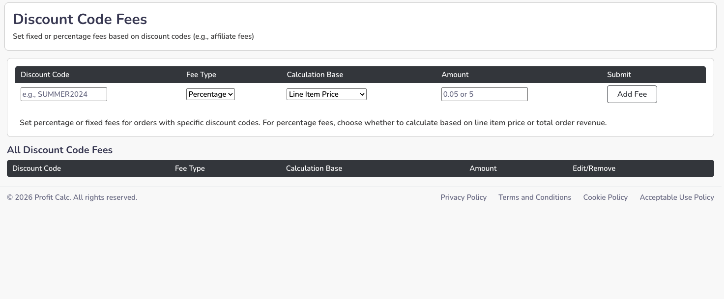 Either fixed or percentage fees can be set up based on the Discount code included in an order on this page here.