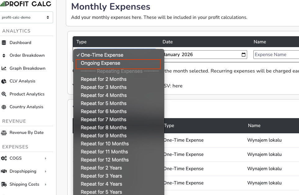 How to create ongoing/repeating monthly expenses?